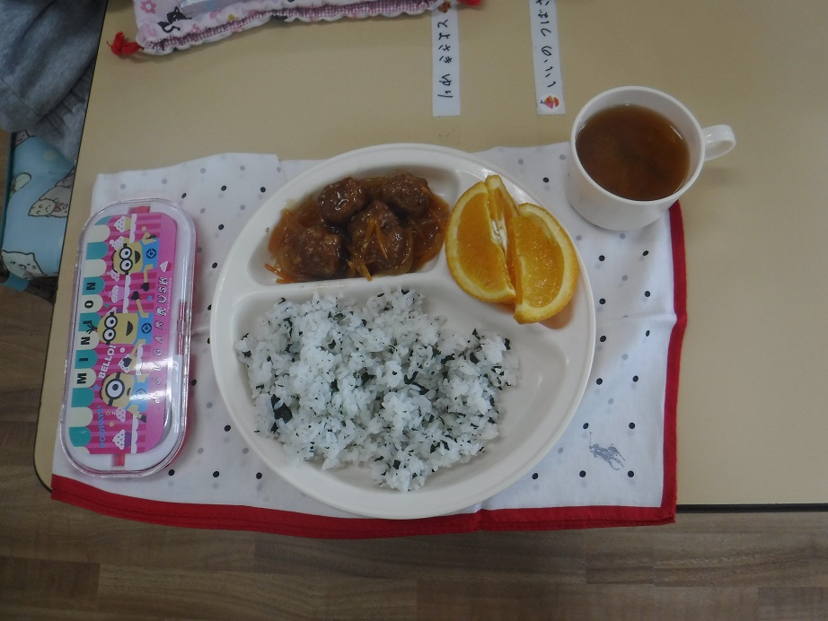 わかめごはん、肉団子の甘酢炒め、オレンジ、かき玉汁