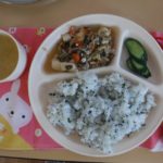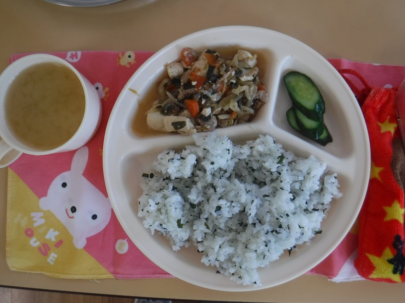 わかめごはん、豆腐チャンプルー、きゅうりの浅漬け、味噌汁