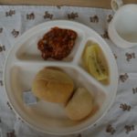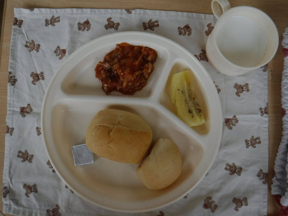 パン、鶏肉ときのこのトマト煮、果物、牛乳