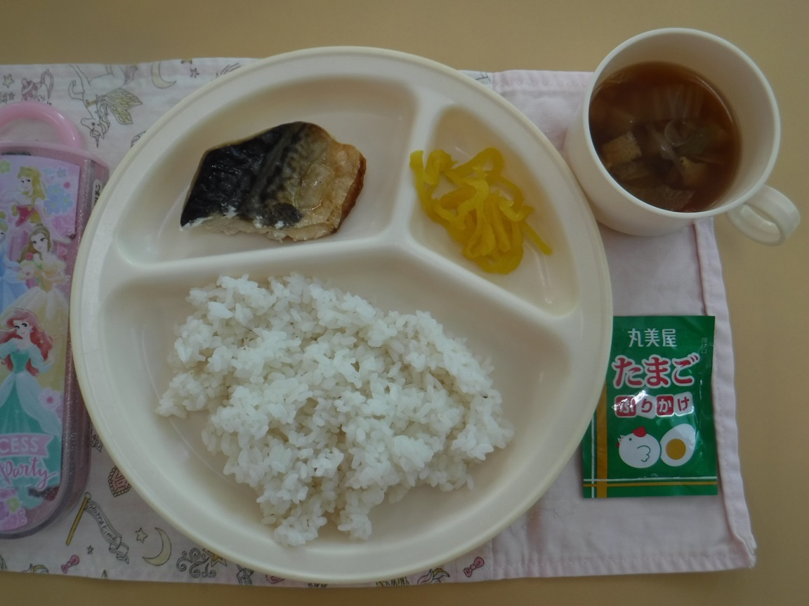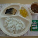 ごはん、魚の塩焼き、漬物、けんちん汁