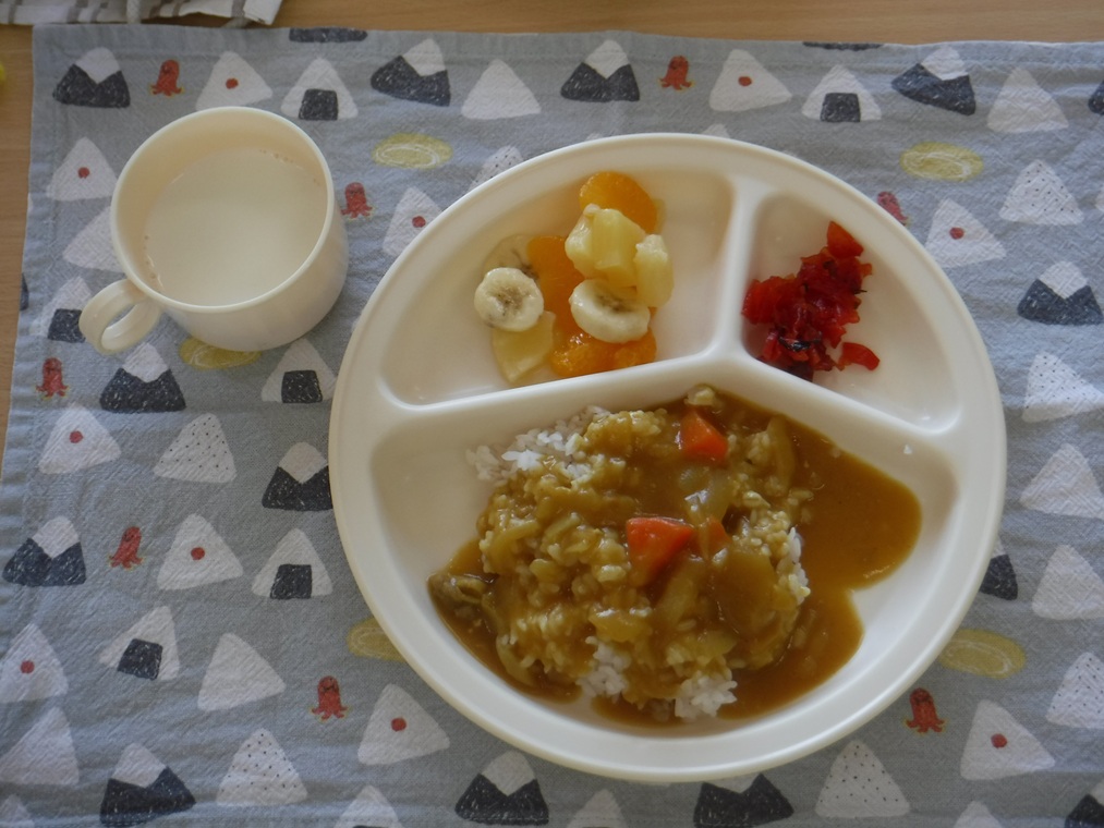 カレーライス、福神漬、フルーツサラダ、牛乳