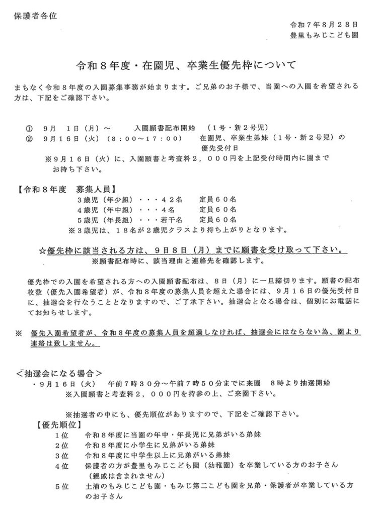 令和8年度・在園児、卒業生優先枠について