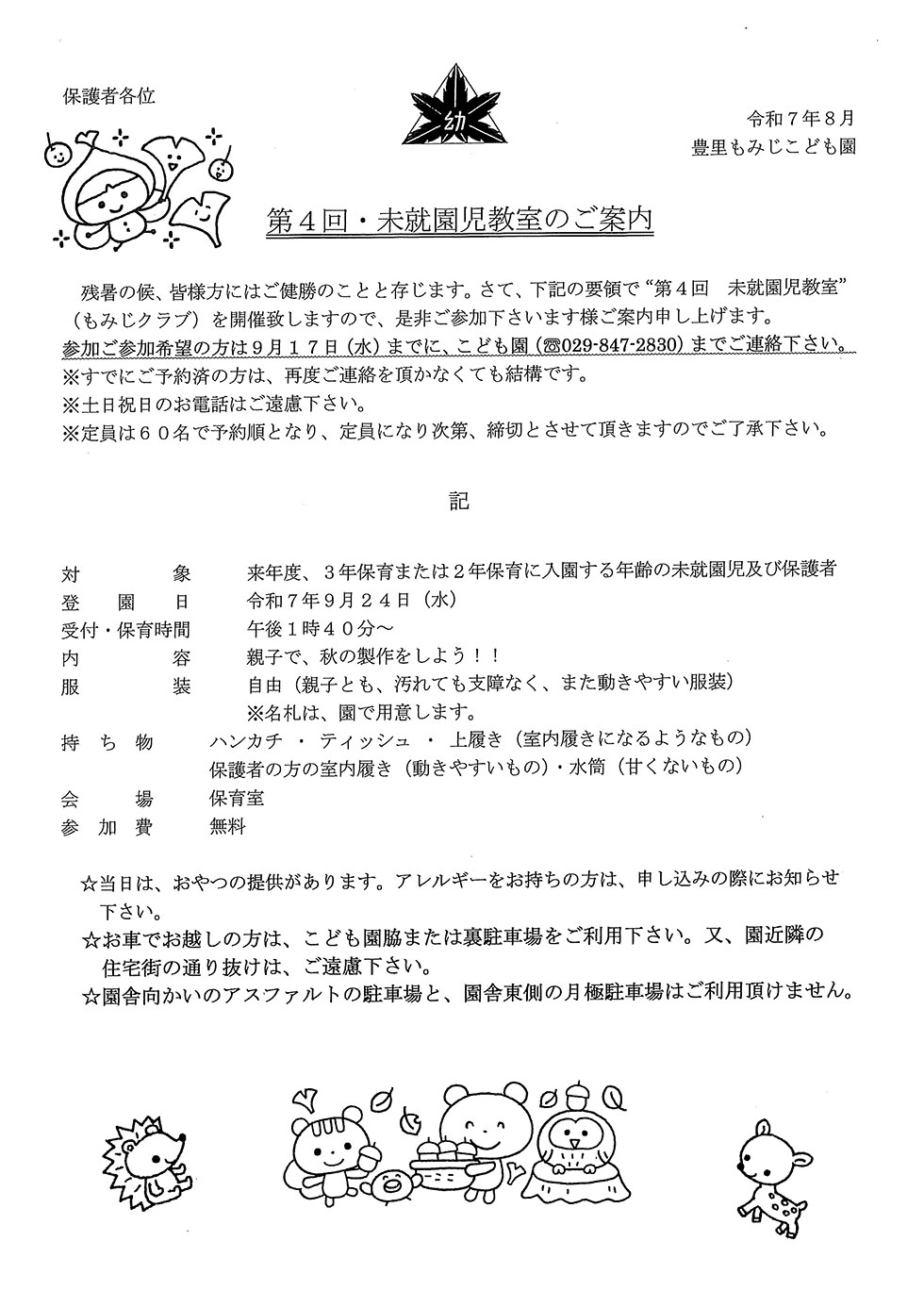 第4回・未就園児教室のご案内 2025年8月25日 園からのお知らせ by admin. 9月24日(水)に、第4回目の未就園児教室(もみじクラブ)を行ないます。 現在、参加者を募集しています。参加ご希望の方は、お電話またはレーザーキッズにてお申込み下さい。 参加対象者は、来年度3年保育または2年保育に入園する年齢の未就園児及び保護者 申込締め切:9月17日(水)問合せ先:029-847-2830 前の記事 次の記事