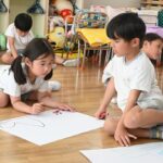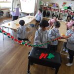赤と緑を交互に繋げ、近くのお友達と繋げ、更にクラス全員のものを繋げて長い1本の輪つなぎが完成すると、子ども達は「うわっ~!長~い!」と皆で歓声をあげて大喜びしていました。