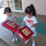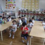 久し振りのカスタネット!少々戸惑う子もいましたが、カスタネットの持ち方やたたき方を確認しながら「おもちゃのチャチャチャ」の曲に合わせて楽しく、奏でることが出来ました。
