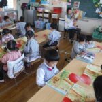 先生の声掛けに合わせてページをめくり、本のまん中をギュッと押さえて見やすくするのが、上手になった子ども達。