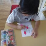 9月16日(火)年少組は、運動会の学年ダンスの衣裳に使用するワッペンに色付けをしました。