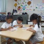 夏の思い出を聞くと「お祭りで〇〇ちゃんに会ったよ」「おじいちゃんやおばあちゃんに会いに行ったよ」等嬉しそうに教えてくれました。