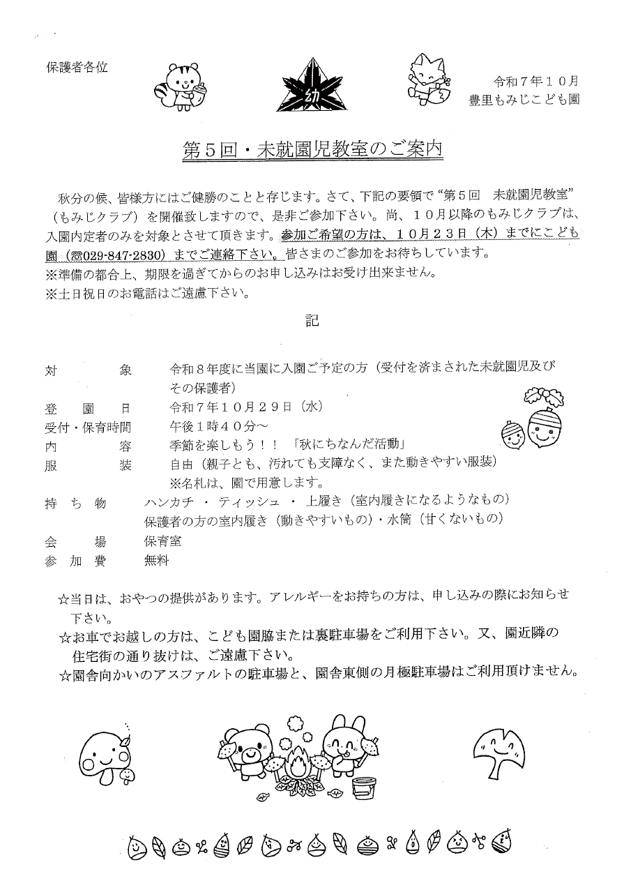 第5回・未就園児教室のご案内 2025年10月22日 園からのお知らせ by admin. 10月29日(水)に、第5回目の未就園児教室(もみじクラブ)を行ないます。 現在、参加者を募集しています。参加ご希望の方は、お電話またはレーザーキッズにてお申込み下さい。 参加対象者は、来年度3年保育または2年保育に入園する年齢の未就園児及び保護者 申込締め切:10月23日(木)問合せ先:029-847-2830 前の記事 次の記事